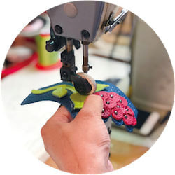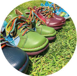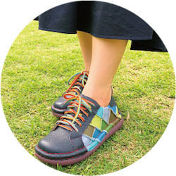 5層ソールを一つ一つ丁寧に組み合わせ、カラフルなレザーのパッチワークもすべて手仕事。